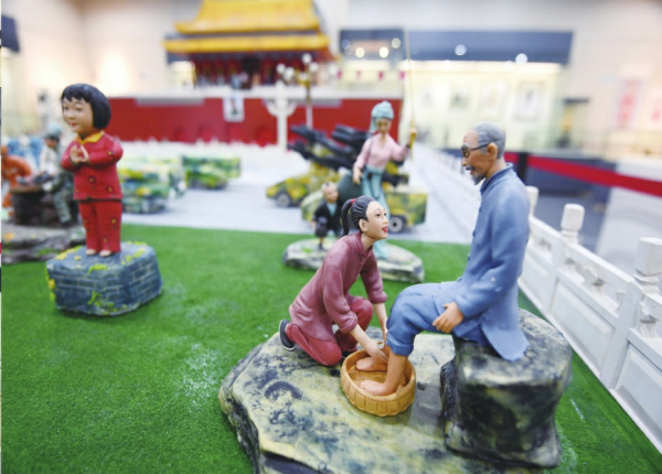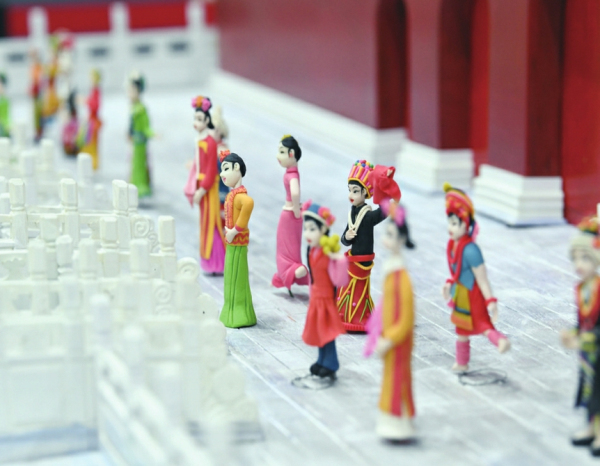 The dough model group shows figures wearing dresses representing China's different ethnic groups. [Photo/dzwww.com]