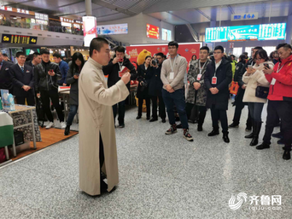 Shandong clapper talk, a traditional performance in China, attracts many onlookers at Jinan West Railway Station. [Photo/iqilu.com]