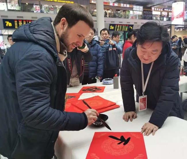 A foreigner tries his hand at writing Chinese characters at Jinan West Railway Station, Huaiyin district, Shandong province on Jan 10. [Photo/WeChat account: huaiyinwenhualvyou]