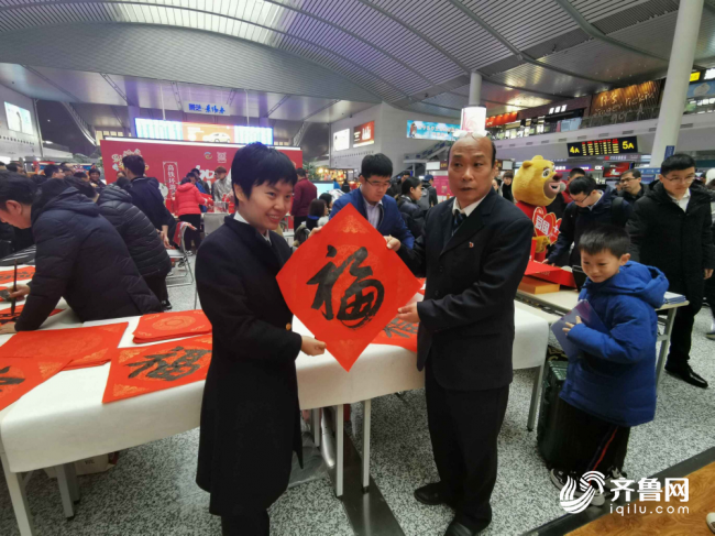 More than 1,000 sets of Spring Festival couplets are prepared for passengers in free. The wall hangings featuring the Chinese character of "Fu", which means good fortune are also on offer. [Photo/iqilu.com]
