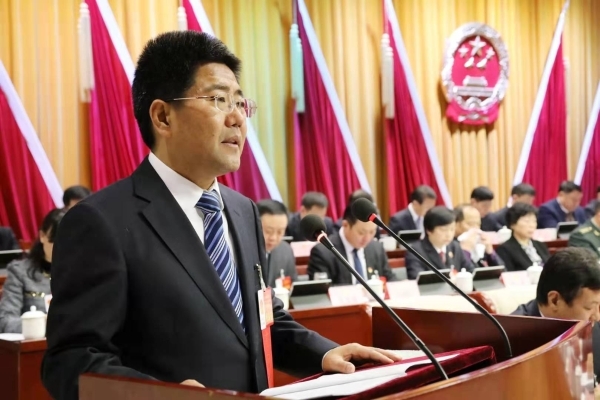 Zhu Yuming, head of Huaiyin district, delivers a government repot at the Huaiyin district people's congress. [Photo/huaiyin.gov.cn]