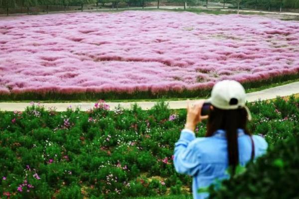 A visitor captures the blooming pink muhly grass at Shanghe Country Park. [Photo/WeChat account: jnslyj]