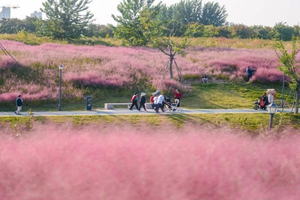 Pink muhly grass is in full bloom in Jinan, painting parks, hillsides, and urban spaces in soft pink. Scenic spots such as Quancheng Talent Park, Jiuru Mountain, Longji River Park, and Shanghe Country Park offer particularly stunning views that are attracting numerous visitors for sightseeing and photography.