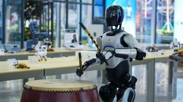 A humanoid robot plays the drums. [Photo/WeChat account: gh_93aae6f1f7c0]