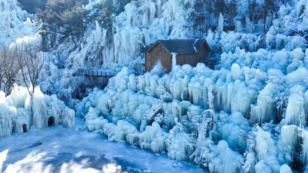 The frozen waterfalls create a dazzling sight at the Jiuru Mountain Scenic Area. [Photo/WeChat account: sdta12301]