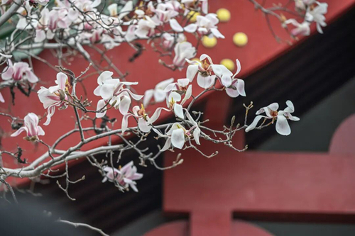 Magnolias bloom against a backdrop of historic pavilions, signaling the start of spring in Jinan. [Photo/WeChat account: jnslyj]