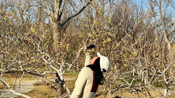 A passerby stops to capture the beauty of the wintersweet. [Photo/Dazhong Daily]