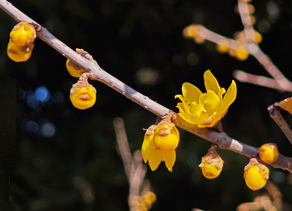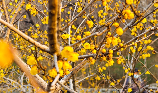Wintersweet is blooming at Qianfo Mountain Park in Jinan. Its small, yellow flowers stand resilient against the cold wind, filling the air with a delicate fragrance. These early bloomers bring a quiet elegance to the park and captivate the attention of visitors.