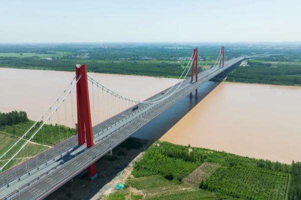 An aerial view of the towering Yellow River Fenghuang Bridge. [Photo/WeChat account: visitjinan]