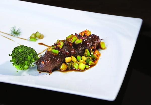 Braised sea cucumber with scallion is a classic Shandong dish. The sea cucumber is simmered in a rich broth and enhanced with the aroma of scallion oil.
