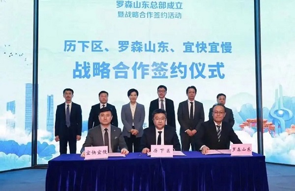 An agreement signing ceremony between Lawson, the Lixia district government, and Yikuai Yiman Mart is held in Jinan. [Photo/WeChat account: Jinanfabu]