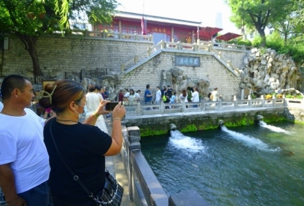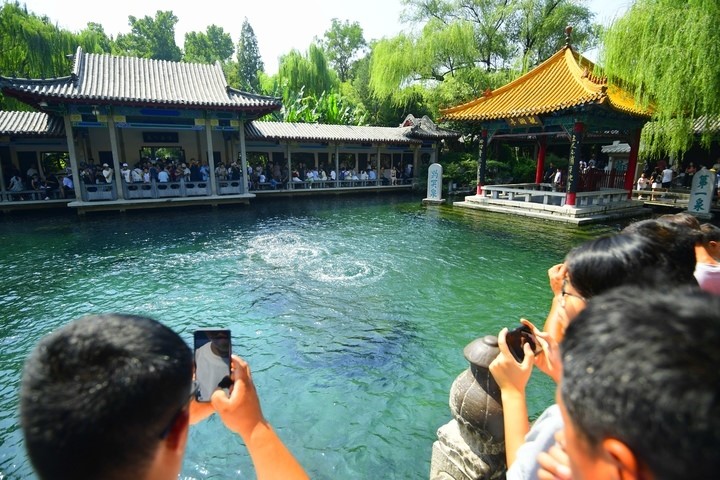 Visitors take pictures at Black Tiger Spring on Aug 30. [Photo by Cui Jian/Jinan Daily]