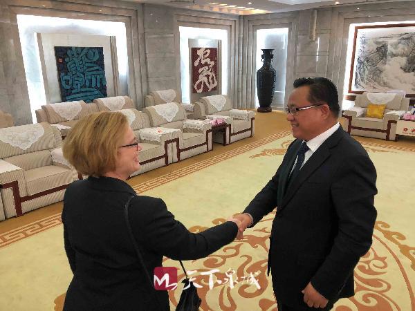 Sun Shutao, the mayor and deputy Party secretary of Jinan, received his Vantaa counterpart, Ritva Viljanen, at Shungeng Hillview Hotel on Nov 1.