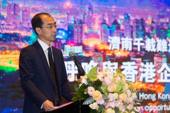Li Zijun, vice-mayor of Jinan city, delivers a speech at the "Transformation of Growth Drivers Promotion Meeting" on Dec 3 in Hong Kong. [Photo by Roy Liu/China Daily]