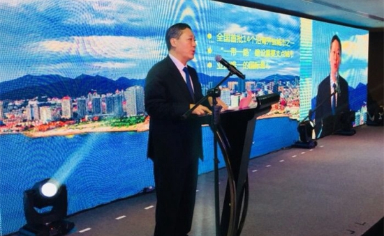 Zhang Shuping, the Party secretary of Yantai, delivers a keynote speech during a promotional event in Hong Kong on Dec 3. [Photo provided to chinadaily.com.cn]