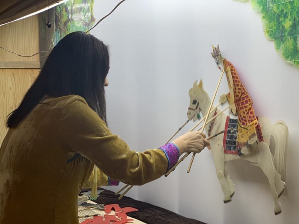 Li Juan, the fifth-generation inheritor of Jinan shadow play, introduces the craft. [Photo by Wang Qian/chinadaily.com.cn]