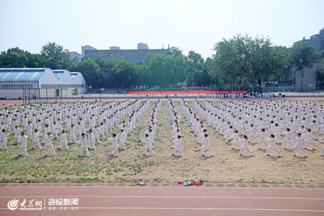 More than 1,000 tai chi enthusiasts play a sparkling tai chi demonstration in Qianfo Mountain campus of Shandong Normal University on May 25. [Photo/dzwww.com]
