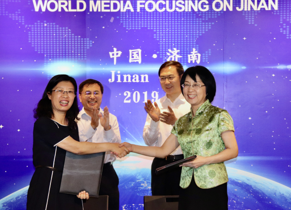 China Daily signes a strategic cooperation framework agreement with Foreign Affairs Office of the Jinan Municipal People's Government to help lift the city's international image and attract more foreign investment. [Photo provided to chinadaily.com.cn]