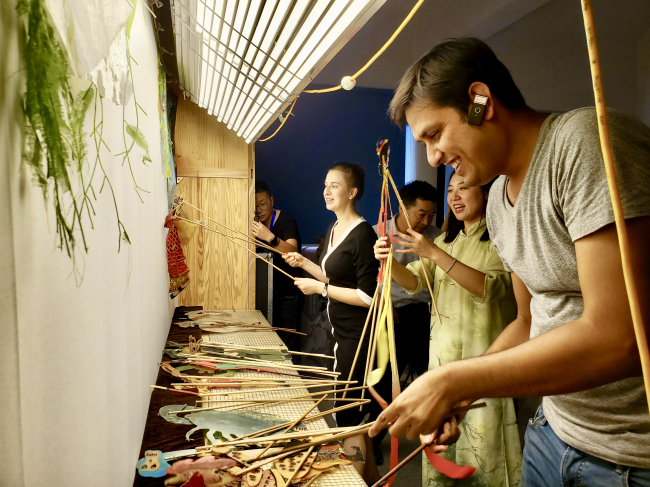 Muhammad Imran, a journalist from the Dawn News in Pakistan, tries his hand at shadow puppets at the Baihuazhou Historical and Cultural Block. [Photo provided to chinadaily.com.cn]