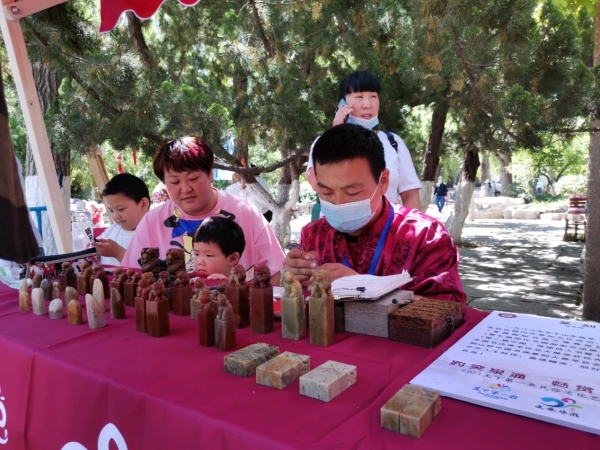 A folk artist shows seal cutting techniques during the opening of Jinan's folk culture month. [Photo/WeChat account: jnbtq1]