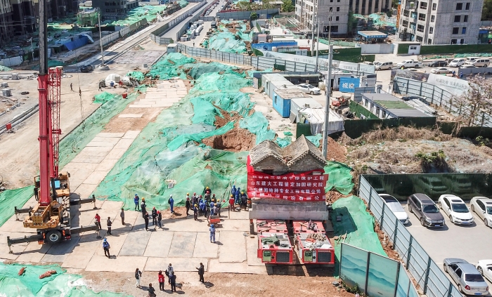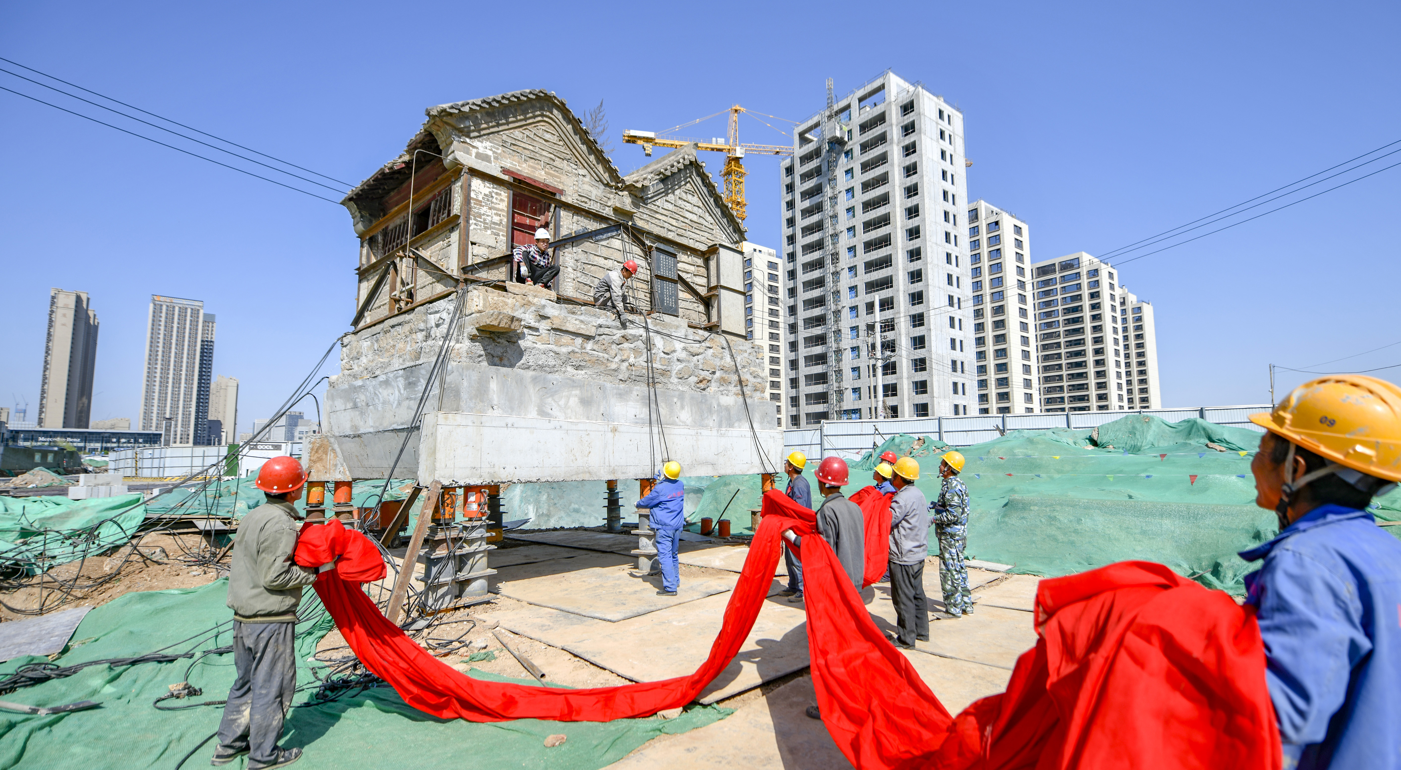 Workers prepare to move Sansheng Temple to make way for a new road in Jinan, Shandong province, on Sunday. The temple has a history of more than 400 years. [Photo by WANG FENG/FOR CHINA DAILY]