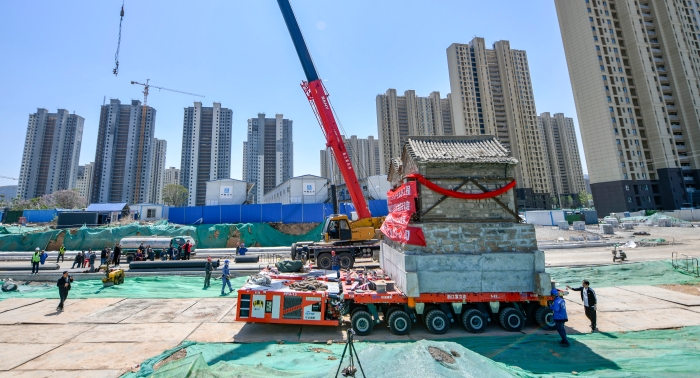 The temple sits on two vehicles during the move. [Photo by WANG FENG/FOR CHINA DAILY]